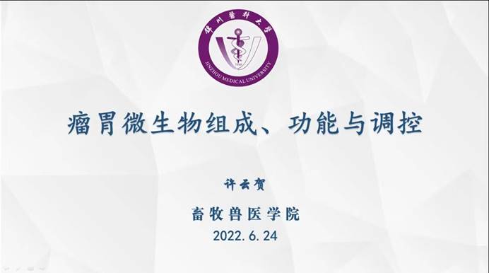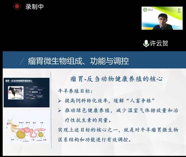 许云贺教授对瘤胃微生物的功能、调控,营养调控和酸中毒的调控等内容做了详细讲解,对绿色养殖、健康养殖具有重要的启发和指导意义。讲座结束后,他就师生提出的问题进行了在线解答和互动交流。