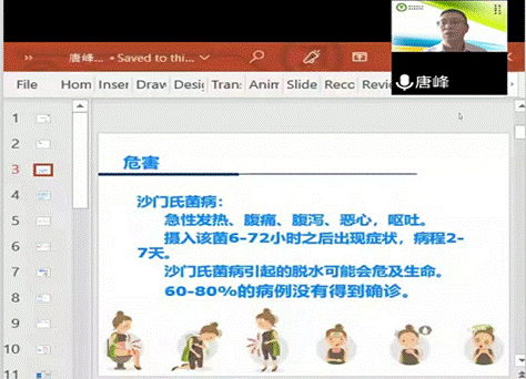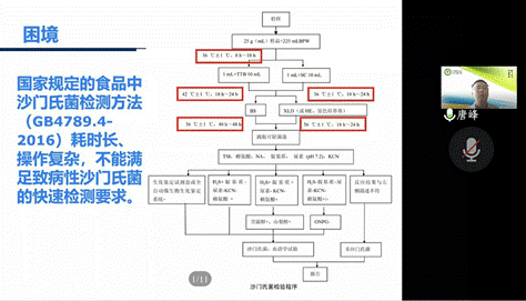 唐峰副教授从肠炎沙门氏菌SdfⅠ基因标准质粒构建、肠炎沙门氏菌CPA方法建立及优化和核酸试纸条可视化检测方面进行详细讲解。讲座结束后,他就师生提出的问题进行了在线解答和互动交流。