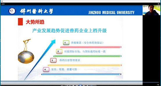 王铁良教授讲授了新版兽药质量管理规范从硬件、软件、人员等对不同车间,剂型提出更高的要求,供给侧下各省兽药GMP认证情况分析等。讲座结束后,他就师生提出的问题进行了在线解答和互动交流。