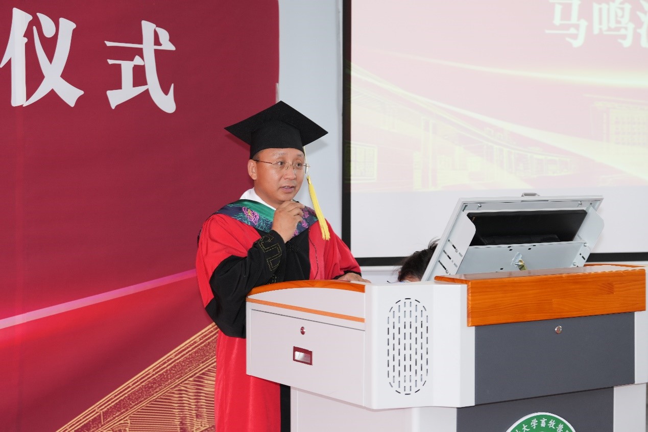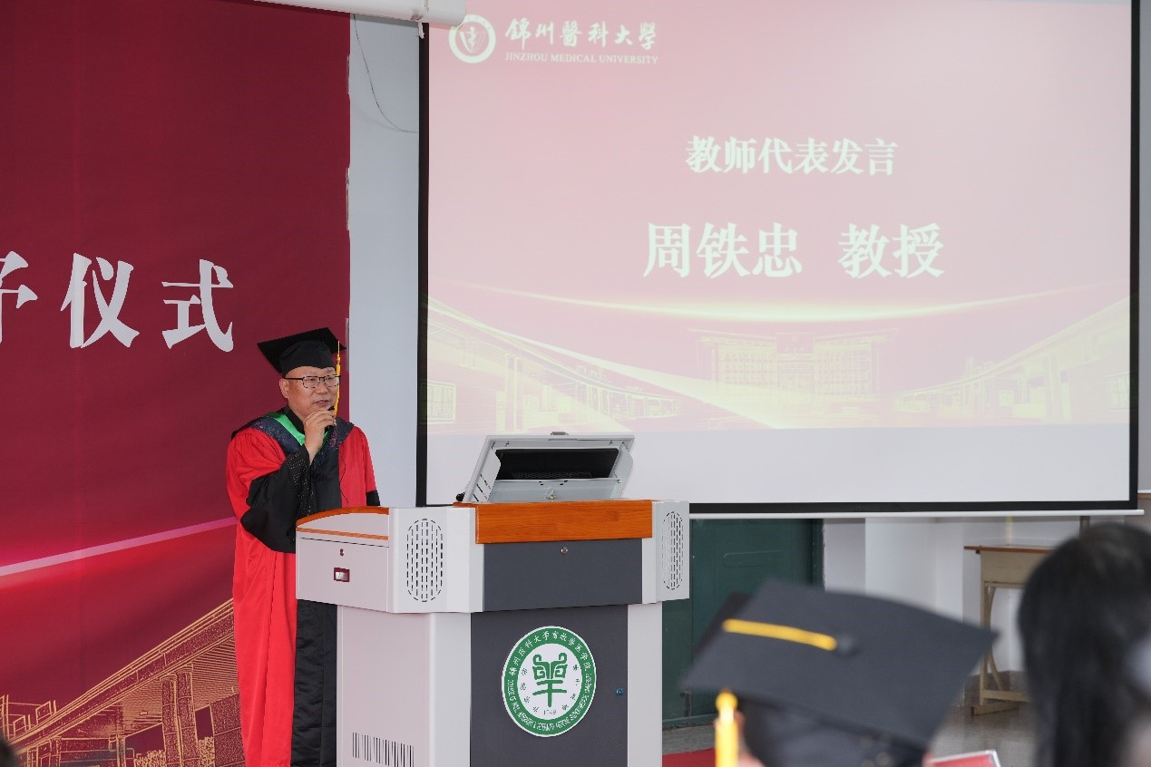 教师代表周铁忠教授鼓励同学们守信仰,在奋进的人生中勇于担当,在美好的未来中力求卓越,母校永远会关注、支持、祝福着同学们,祝愿学子平安顺遂、前程似锦,用智慧和勇气书写出更加灿烂的人生篇章。