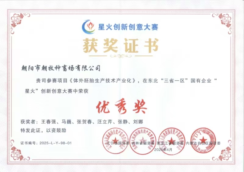 近日,东北“三省一区”国有企业“星火”创新创意大赛结果揭晓,由公司王春强教授团队代表朝阳市朝牧种畜场有限公司主持的《体外胚胎生产技术产业化》项目,凭借其显著的产业转化潜力与创新性,荣获大赛优秀奖。